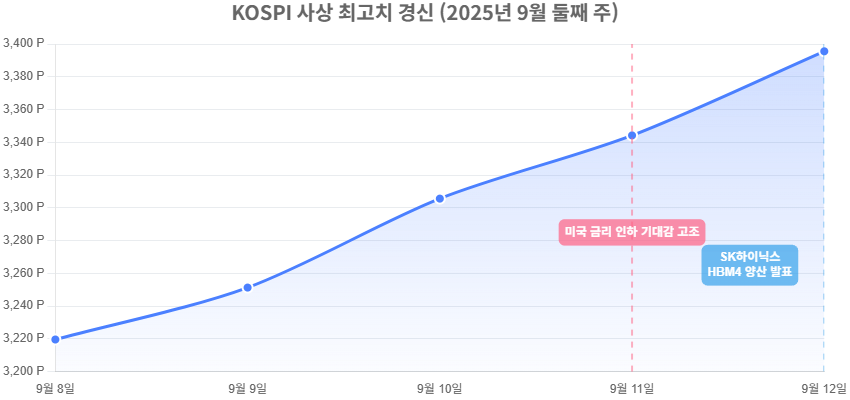 요약: 2025년 9월 12일, 코스피가 3거래일 연속 사상 최고치를 경신했습니다. 이 역사적인 랠리의 배경에는 ①미국의 금리 인하 기대감에 따른 글로벌 유동성 확대, ②원화 강세로 인한 외국인 자금의 대규모 유입, 그리고 ③SK하이닉스의 HBM4 세계 최초 양산 발표라는 세 가지 핵심 동력이 완벽한 시너지를 일으켰습니다. 본문에서는 이 '퍼펙트 스톰'의 원인을 심층 분석합니다.