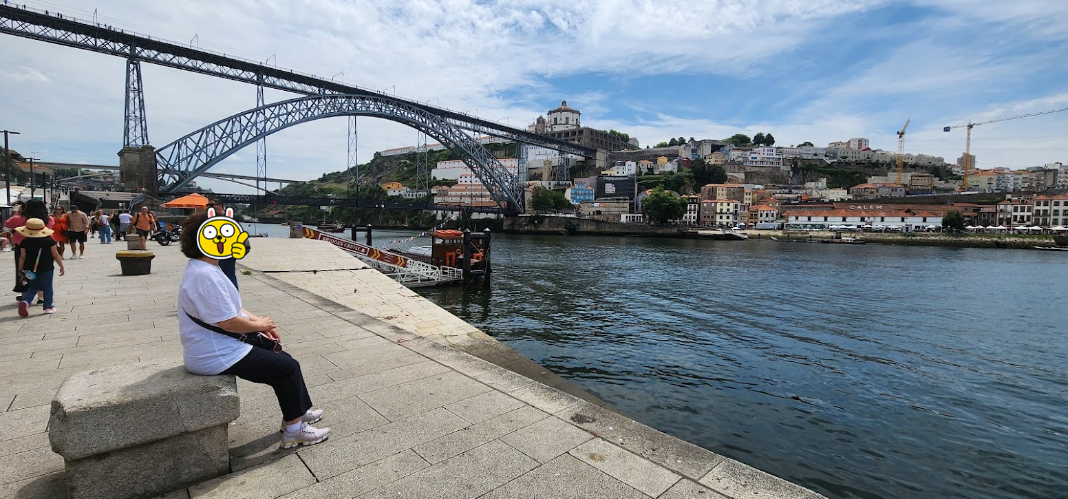강변을 따라 걷는 사람들의 모습, 그리고 저 멀리 보이는 루이스 1세 다리까지, 포르투의 낭만이 한데 어우러진 풍경이었어요.