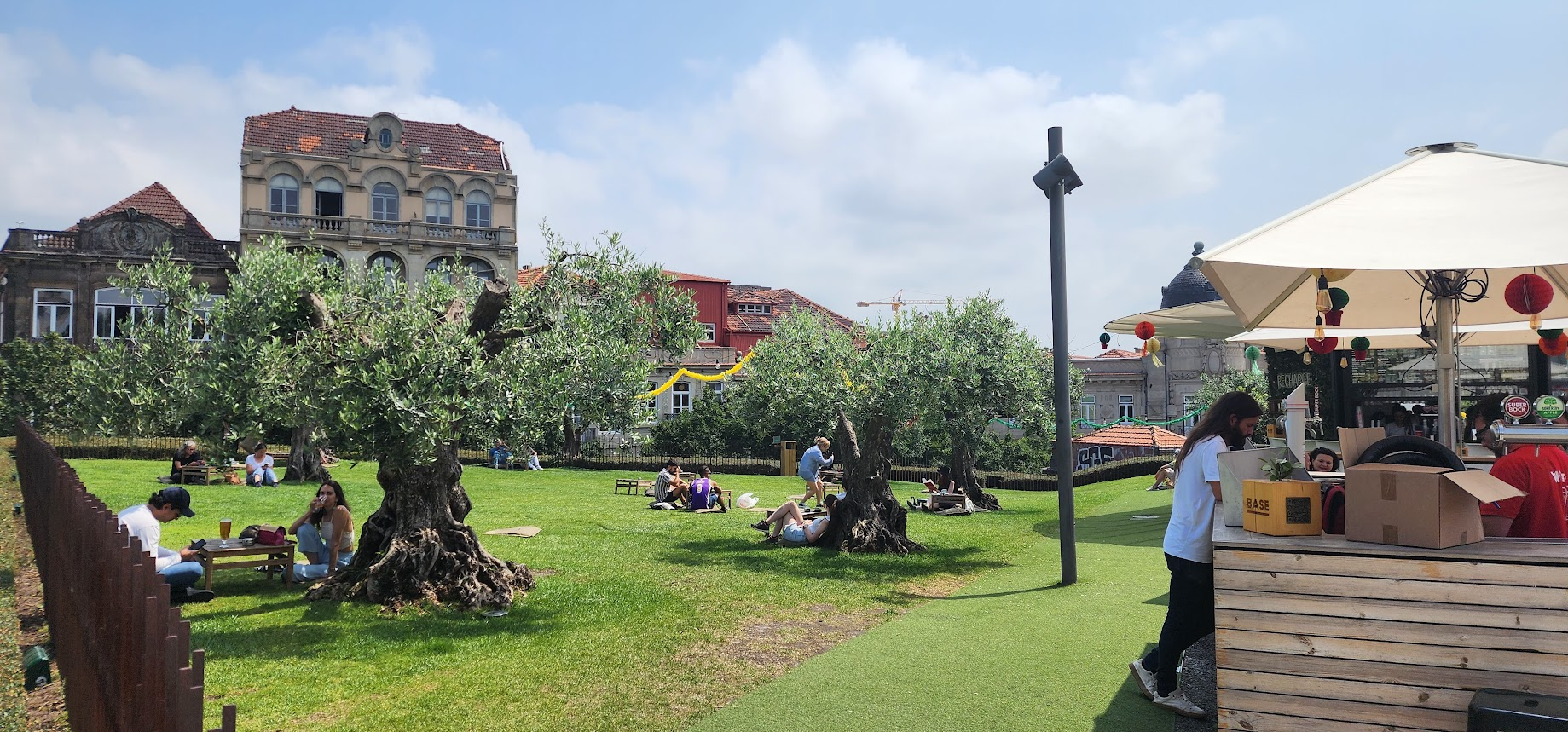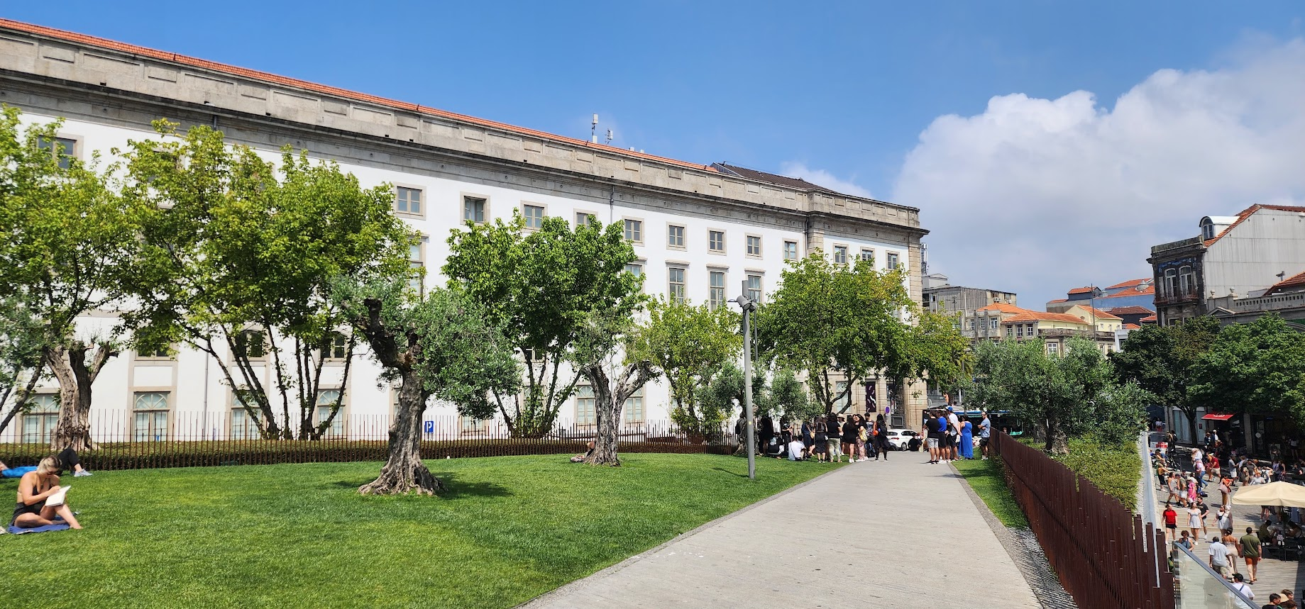 푸른 잔디와 올리브나무 사이로 보이는 고풍스러운 건물들이 포르투의 독특한 분위기를 더해줍니다.