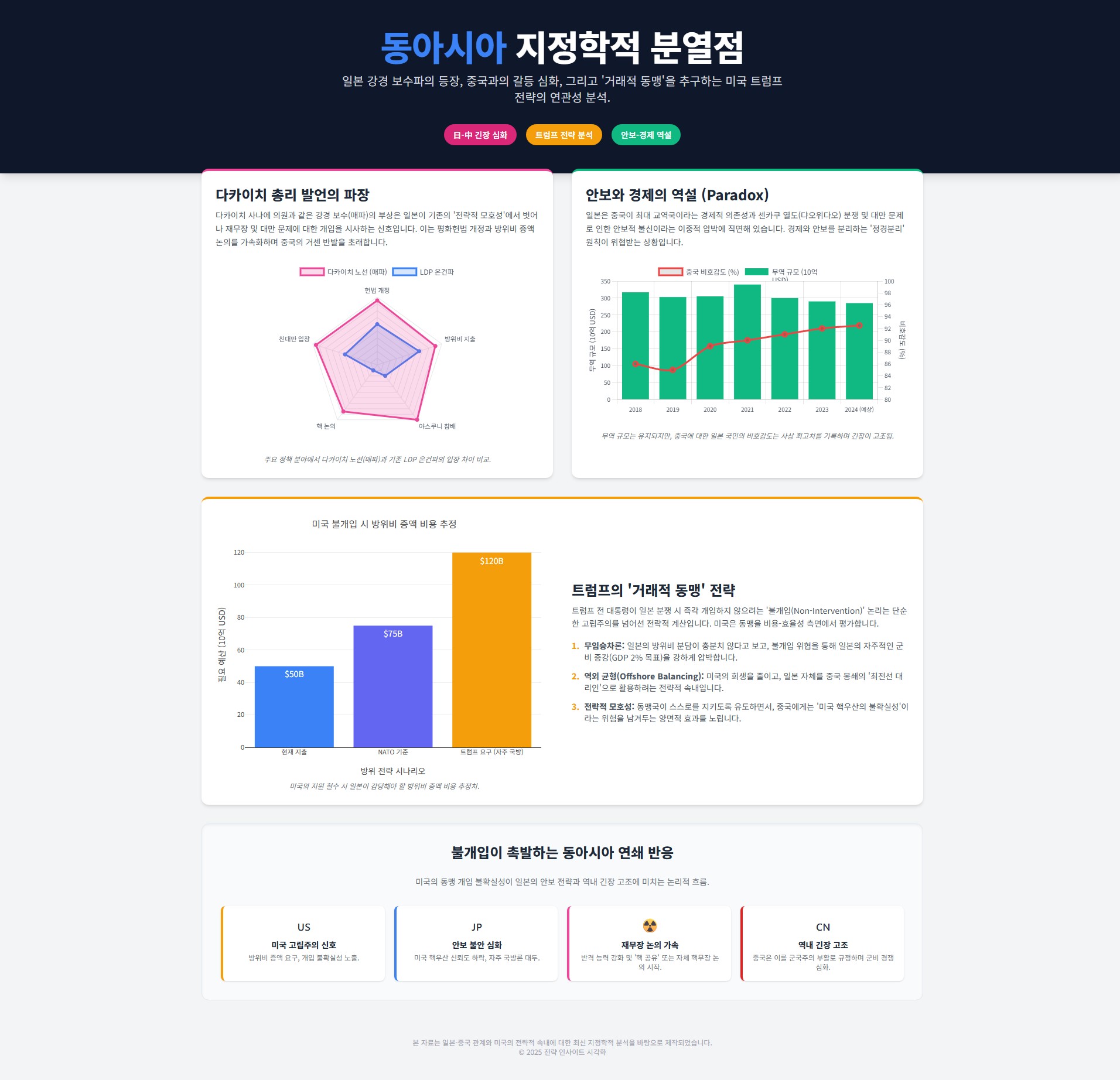 - 일본은 미국의 자동 개입이 없음을 깨닫고 국방비 2% 조기 증액 등 독자적 방위 역량 강화에 속도를 낼 전망입니다.