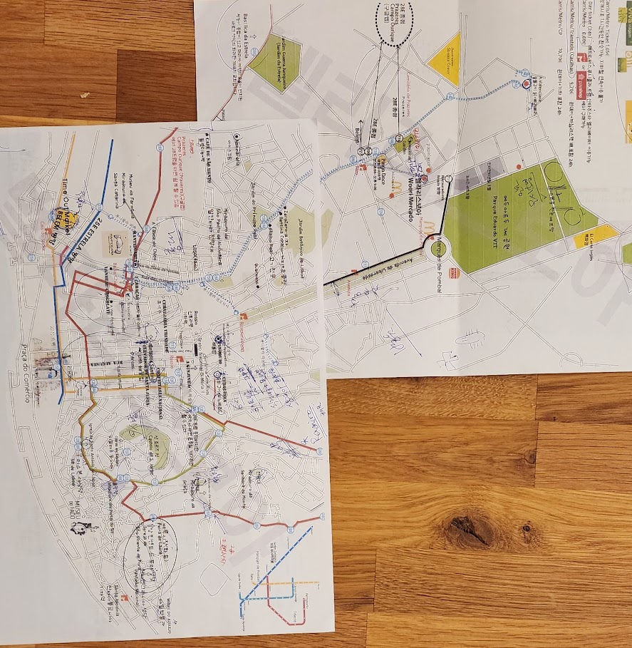 바로 제가 묵었던 한인 민박집 사장님께서 리스본을 처음 방문하는 저희를 위해 직접 손으로 꼼꼼하게 설명하며 표시해 주신 소중한 지도예요!
