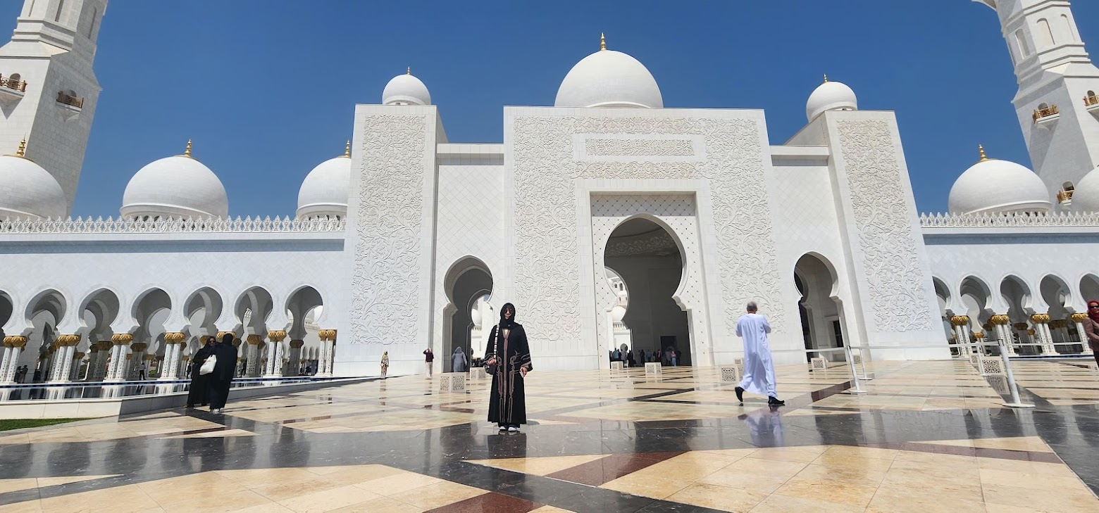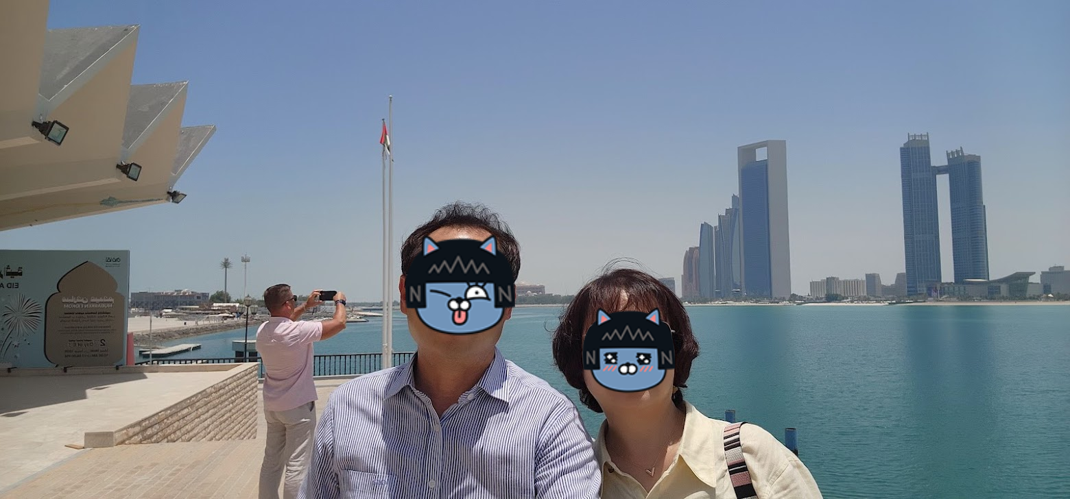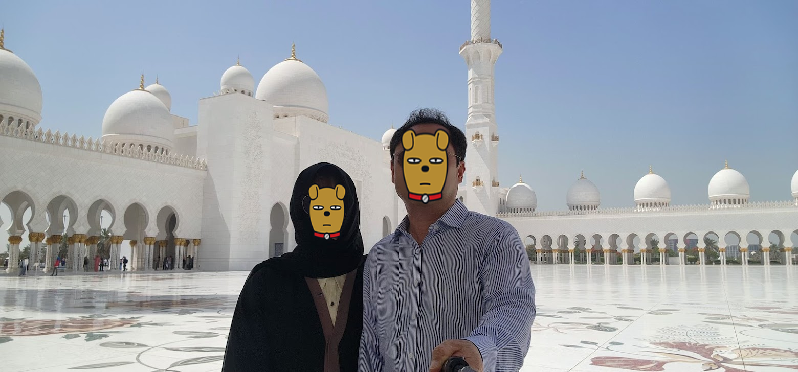 이곳에서 저희는 아주 특별한 만남을 가졌어요. 바로 현재 아부다비에 살고 있는 제 초등학교 친구를 만난 것이죠! 사실 저와 제 반쪽은 초등학교 동창이라, 셋 모두가 어린 시절을 함께 보낸 친구랍니다. 먼 이국땅에서 수십 년 만에 친구를 다시 만나니 감회가 정말 새로웠어요. 친구는 제 아내를 위해 직접 '아바야(Abaya)'를 빌려주었고, 덕분에 저희는 무사히 모스크에 입장할 수 있었죠. (이곳은 여성의 복장 규정이 매우 엄격하답니다!)