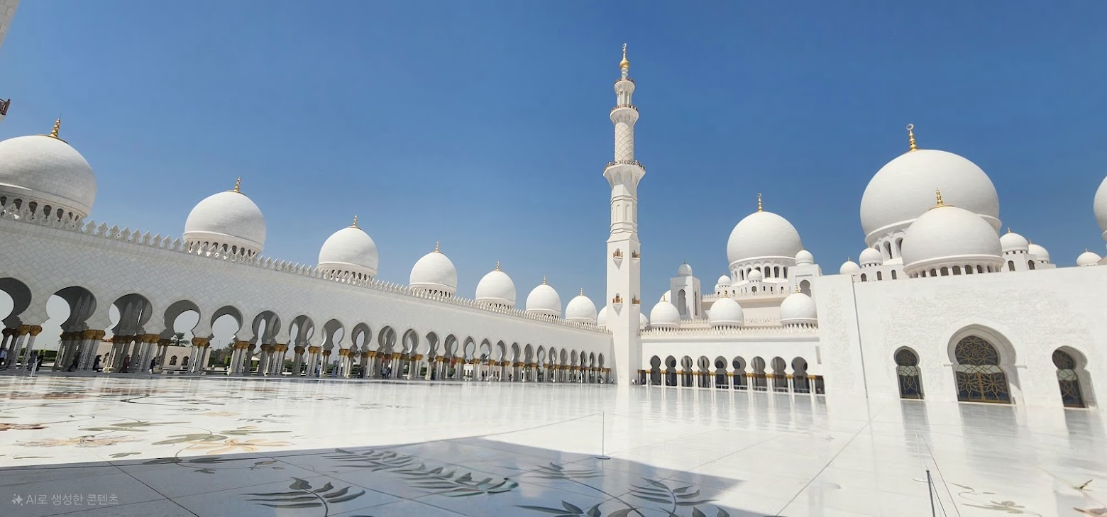 오전 내내 달려 도착한 곳은 아부다비의 상징이자 이번 여행의 하이라이트, '셰이크 자이드 그랜드 모스크'였습니다. 눈부신 순백색의 웅장한 자태는 현실이 아닌 것처럼 느껴질 정도였죠. 모래바람 때문에 흰색 건물을 유지하기가 무척 어려움에도 불구하고, 티끌 하나 없이 완벽한 모습에 감탄이 절로 나왔습니다.