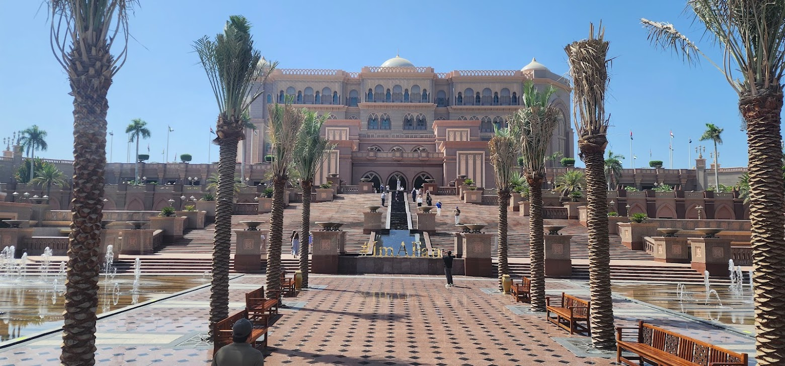 점심 식사 후, 저희는 아부다비의 위엄을 느낄 수 있는 곳들을 둘러봤어요. 화려함의 극치인 '대통령 궁(카스르 알 와탄)'과 세계 유일의 '8성급 호텔'로 불리는 에미레이트 팰리스 호텔의 웅장한 모습을 감상했죠. 이어서 해안 도로인 '코니쉬'를 방문해 아부다비의 아름다운 스카이라인을 눈에 담았습니다.