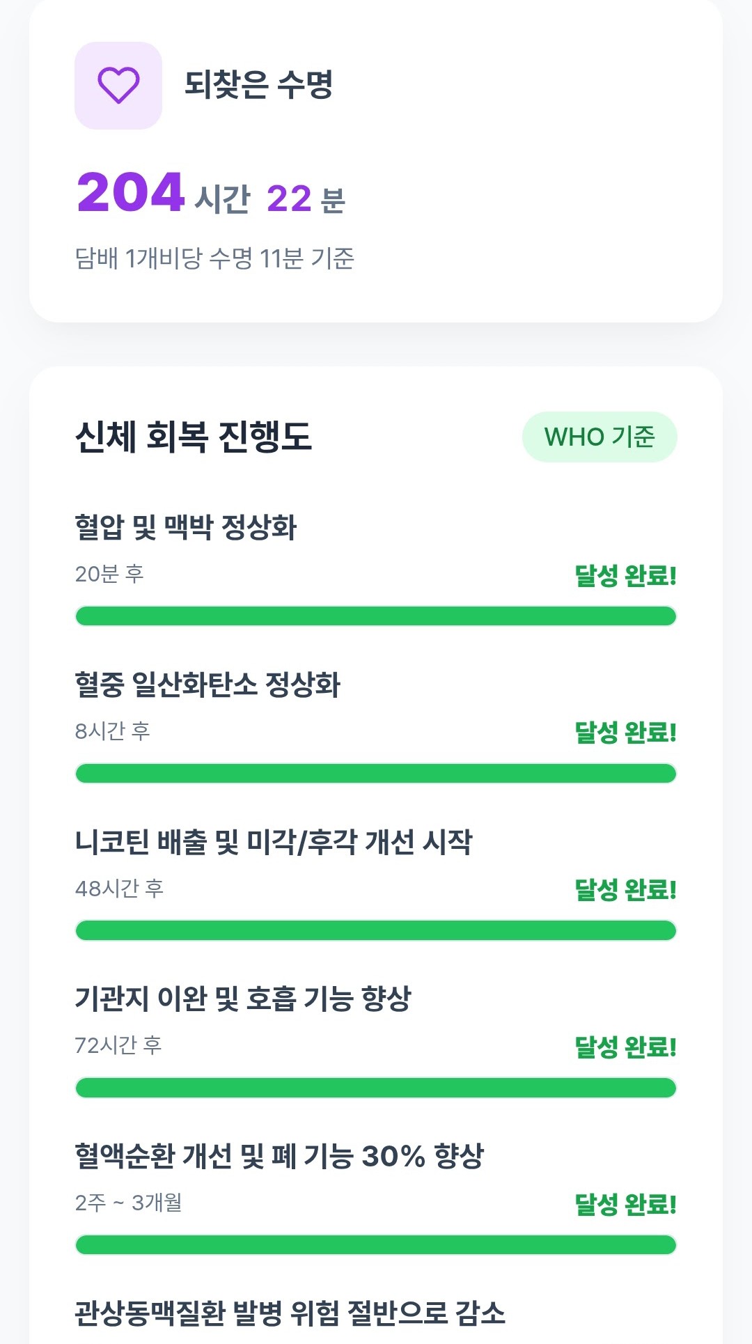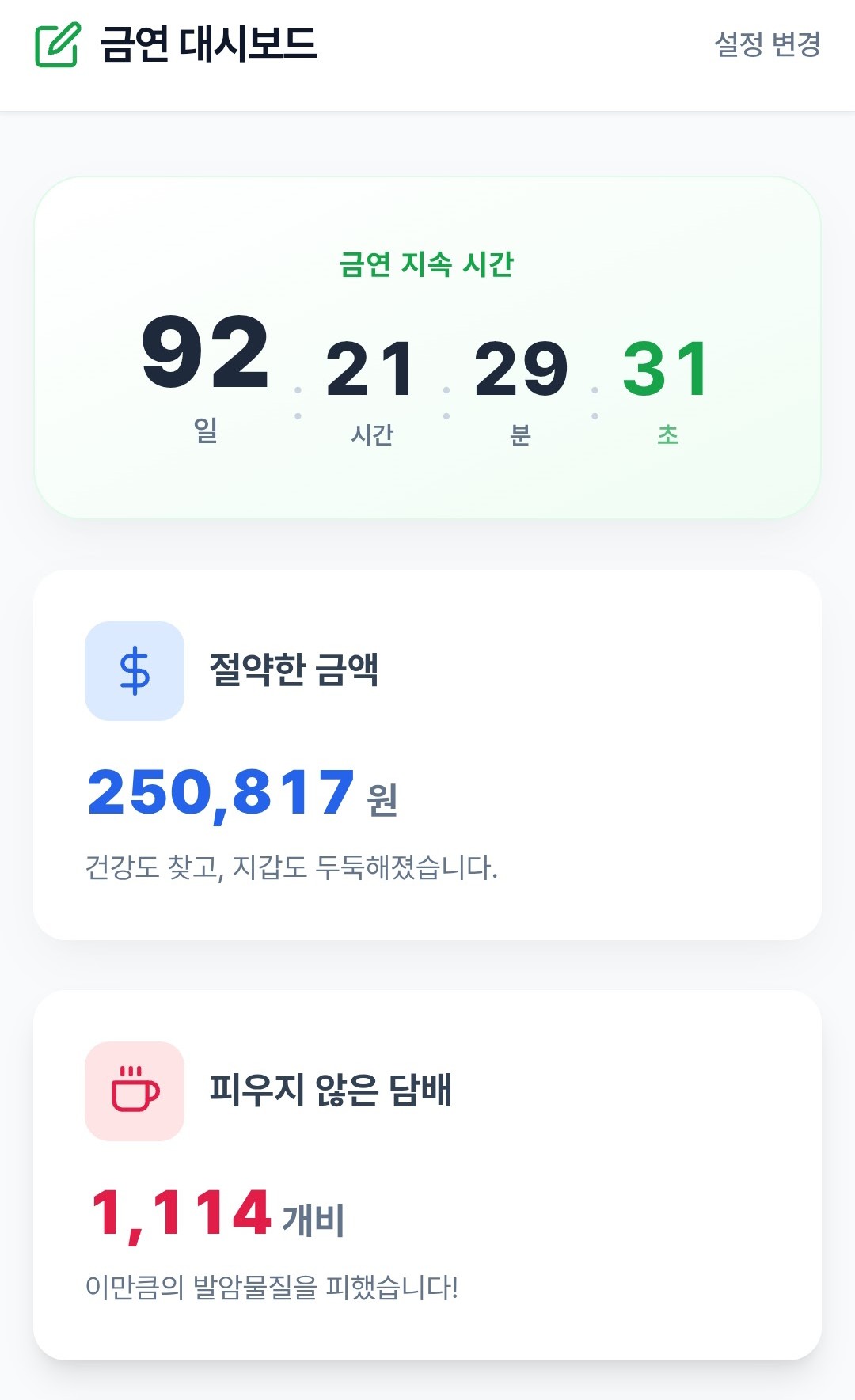 그 앱의 화면 위에는 WHO 기준에 따라 시각화된 데이터가 조용하지만 단호하게 카운트되고 있었다. 지난 93일간 참아낸 1,114개비라는 명징한 숫자, 절약한 금액 25만여 원, 그리고 무엇보다 되찾은 수명 204시간 22분. 특히 신체 회복 진행도를 보여주는 백분율 그래프와 WHO 기준 지표들을 보니, 나의 투쟁은 더욱더 가치 있는 것으로 다가왔다. 나를 다스리려 한 줄 한 줄 쳐 내려갔던 그 코드가 만들어낸 숫자들이, 역으로 거세게 흔들리던 나를 단단하게 붙잡아 주었다.
