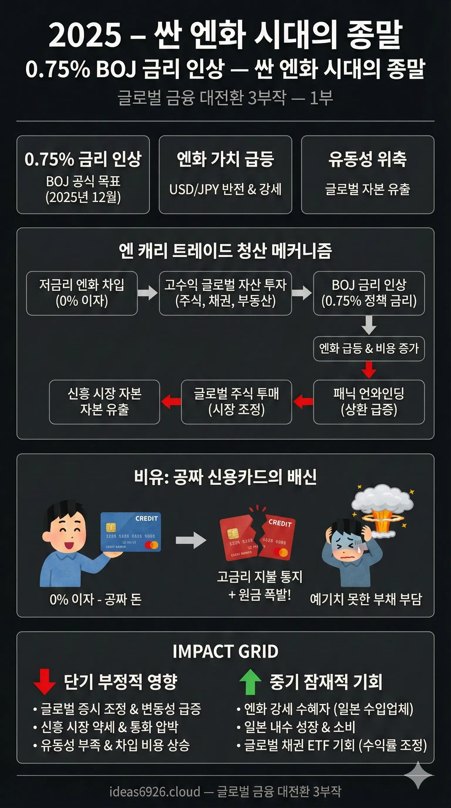 2025년 12월, 세계 경제는 거대한 변곡점 위에 서 있습니다. 일본은행(BOJ)이 12월 금융정책결정회의에서 기준금리 0.75% 인상을 예고하며, 지난 30년간 글로벌 금융 시장을 지탱해 온 '저렴한 엔화' 시대의 종말을 고했기 때문입니다. 이 글은 앞으로 연재될 '금융 대전환 3부작' 중 첫 번째 순서로, 이번 사태의 배경과 핵심 메커니즘을 심층 분석합니다.