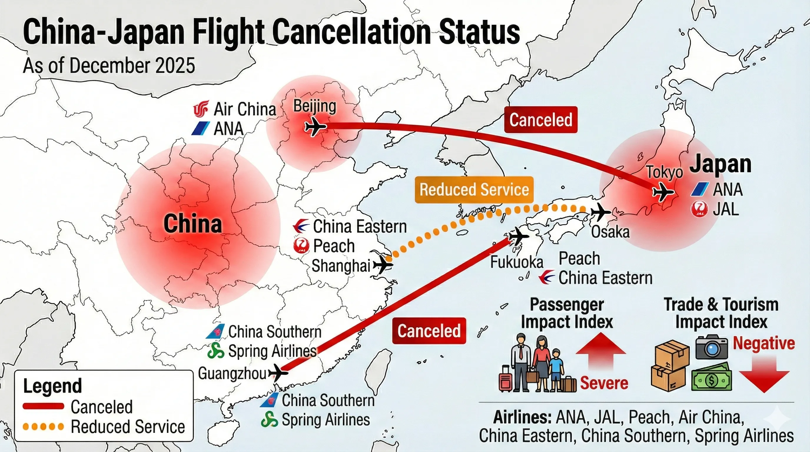중국 주요 항공사들은 12월 한 달 동안 일본행 항공편의 약 16%에 해당하는 904편을 전격 취소했습니다. 이로 인해 약 156,000개의 항공 좌석이 증발했으며, 금융 시장은 이를 아시아 시간대 유동성 공급을 담당하던 중국계 자본(USDT OTC 등)이 이탈하는 신호로 받아들였습니다.