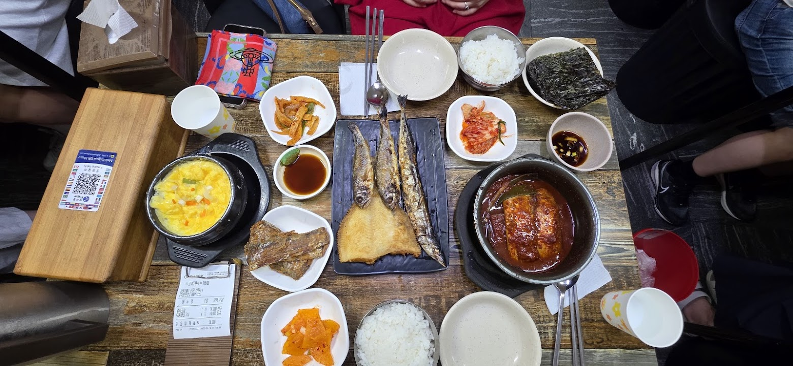 A meal at Jungang Sikdang is an experience of the market's warmth and generosity. The signature Galchi Jorim (braised cutlassfish) features two thick pieces of fish and tender radish in a spicy-sweet sauce, a true 'rice thief' that will have you asking for more rice. The Assorted Grilled Fish (flounder, saury, and two croakers) is grilled to perfection with a crispy skin and moist flesh, providing a savory balance to the spicy stew. The complimentary Gyeran-jjim (steamed egg), soft and warm, completes the meal, turning the market's hustle and bustle into pleasant background music.