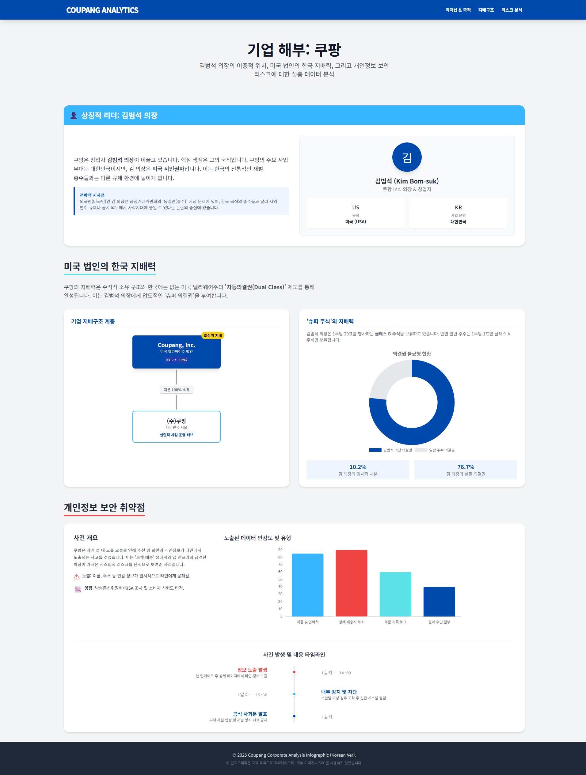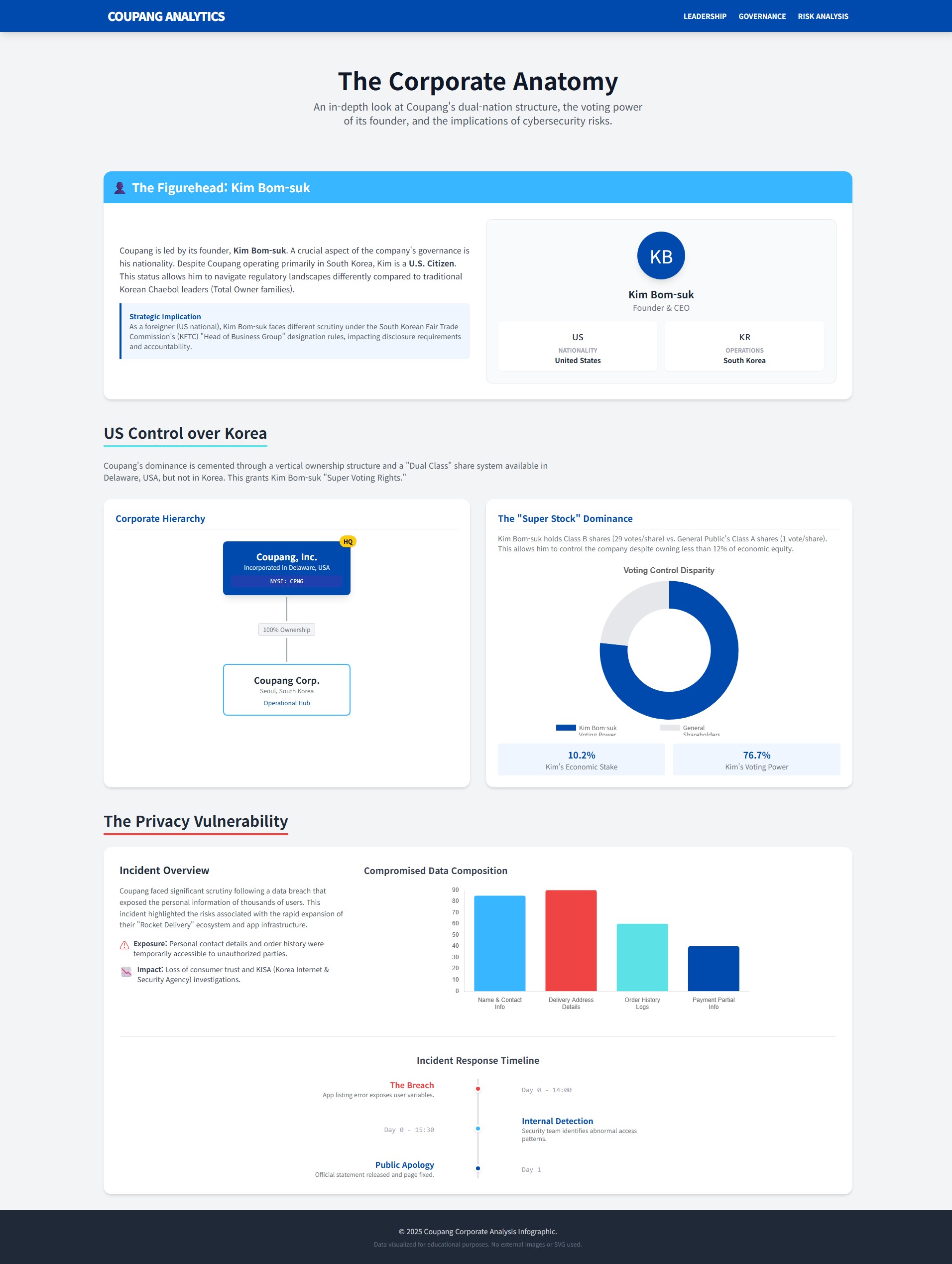 As of 2025, Coupang has established itself as the core logistics infrastructure of the South Korean economy. However, behind its external growth and market dominance lies a unique disconnect between governance and legal responsibility. This report provides an in-depth analysis of Founder Bom Kim's nationality risk, his one-man rule through dual-class shares, and the massive data breach discovered in November 2025.