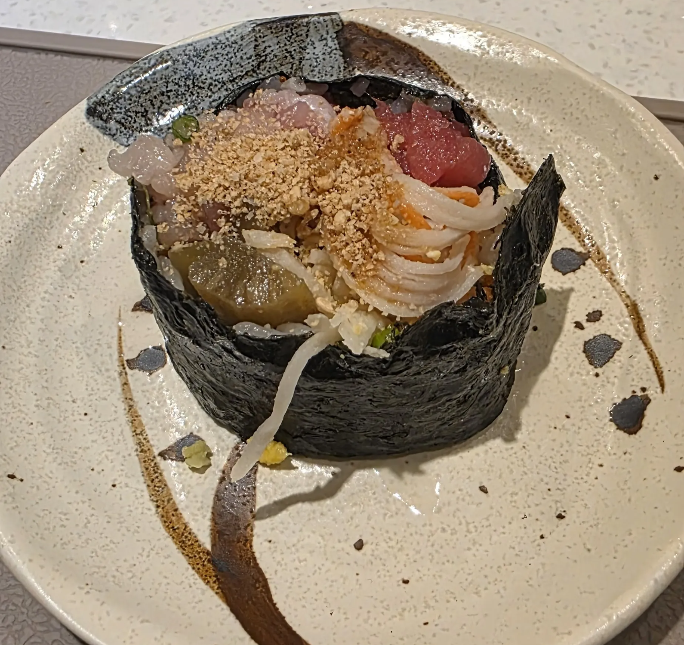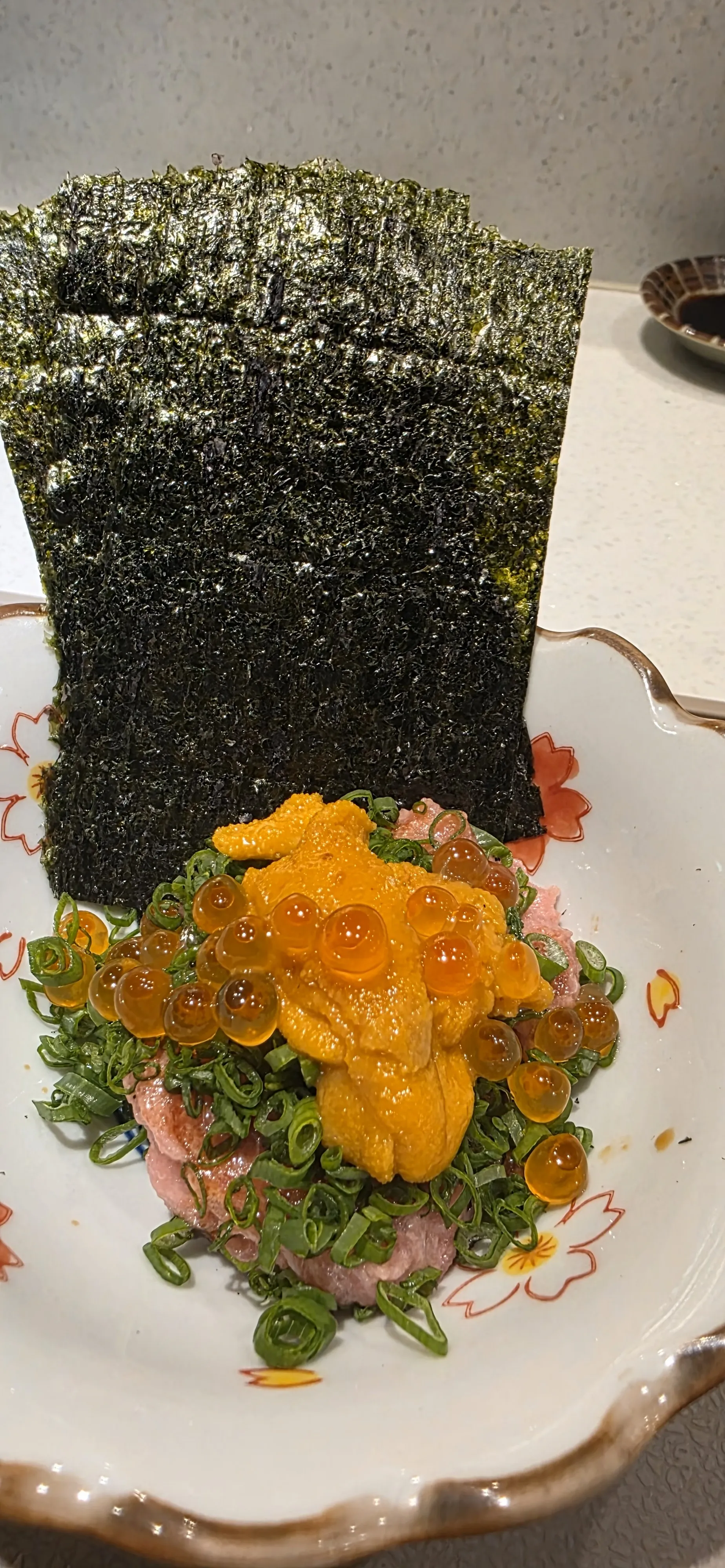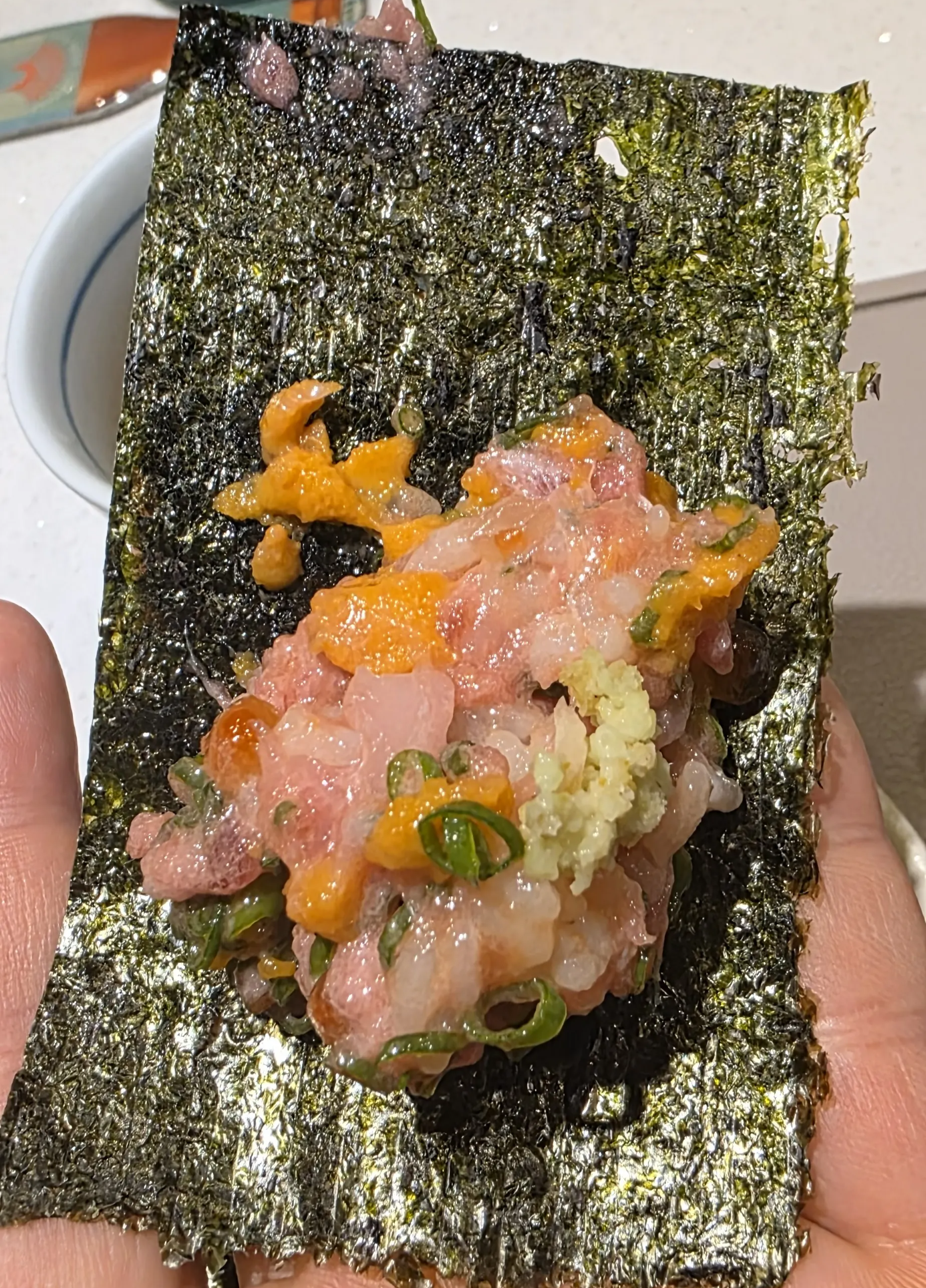 이날의 하이라이트! 성게알(우니), 연어알, 다진 참치를 밥과 섞어 김에 싸 먹는 순간, 바다의 모든 향이 입안에서 축제를 벌이는 듯했습니다.