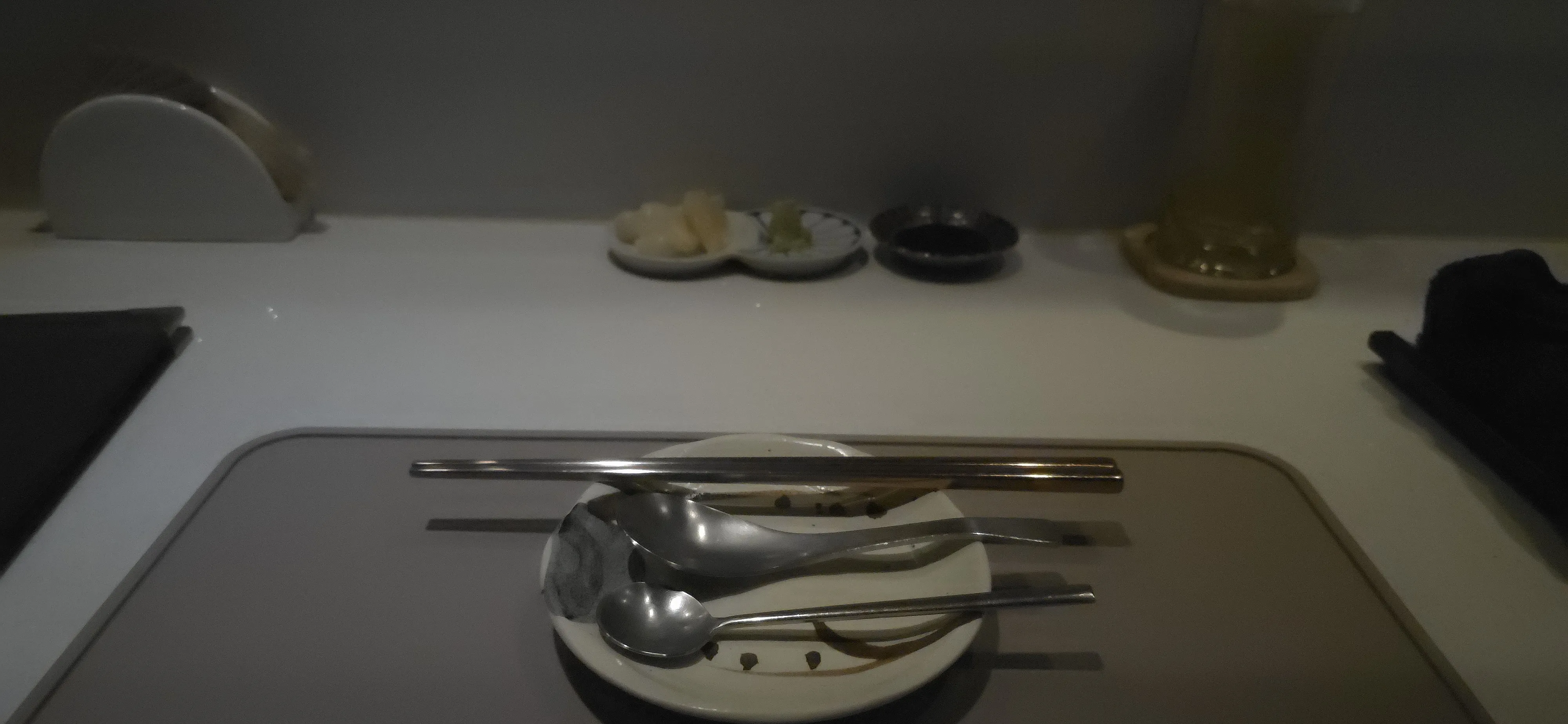 While lively seafood restaurants are good, for an anniversary, a place where you can talk quietly with your spouse while watching the chef cook right in front of you is perfect. The neatly set tableware welcomed us.