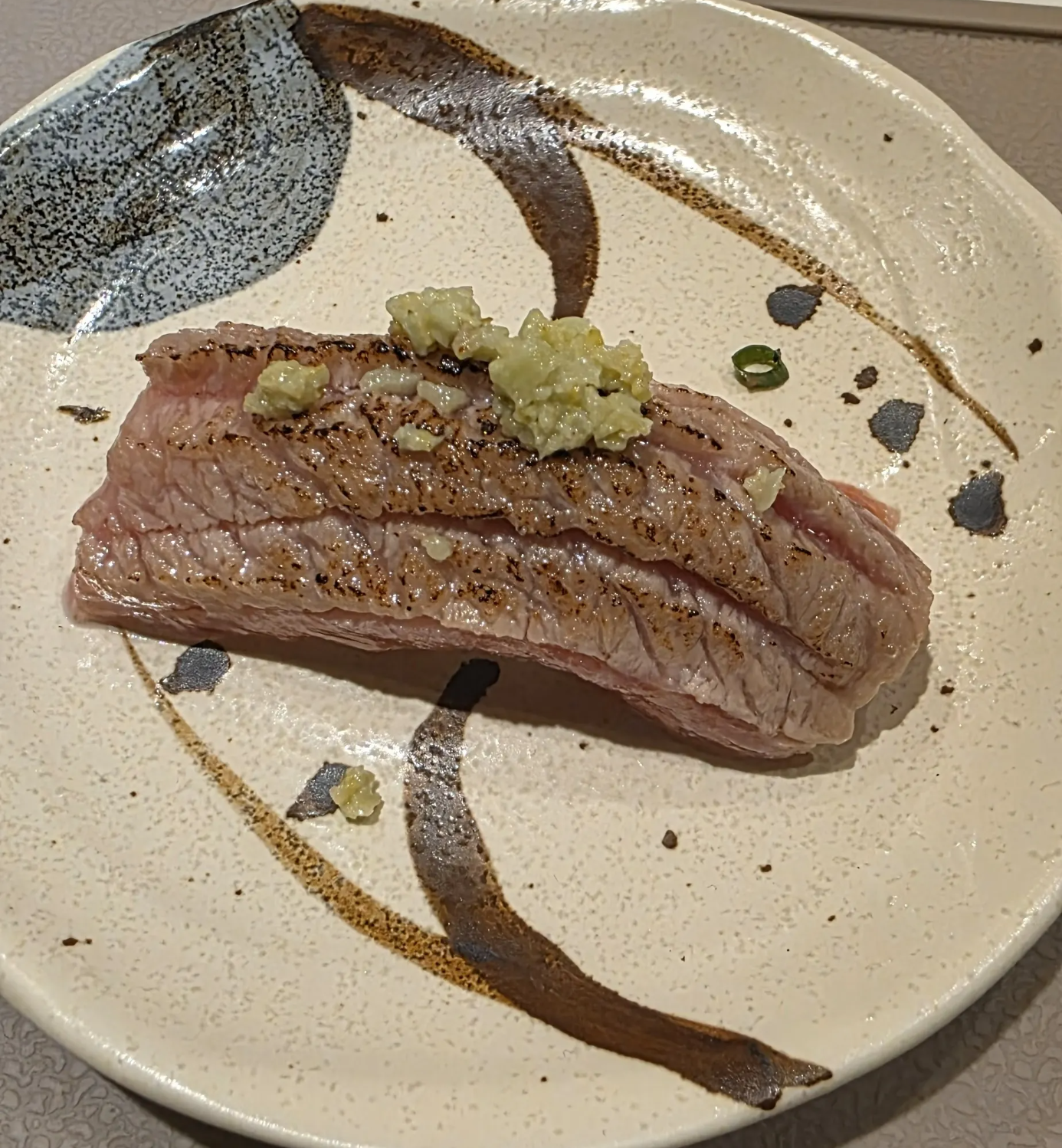 Slightly seared (Aburi) to add a smoky flavor. The rich fat of the belly met the fire and melted like snow in the mouth. "Delicious" was the only word I could say.
