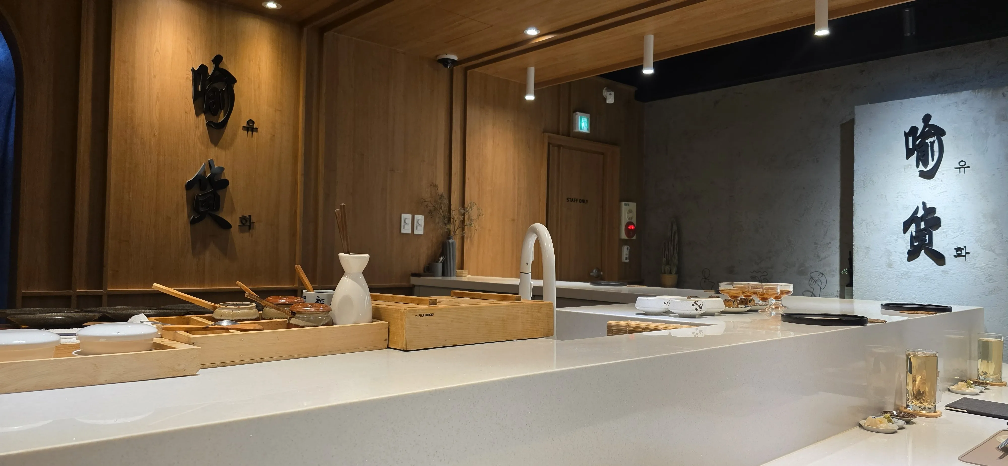 시끌벅적한 횟집도 좋지만, 기념일에는 이렇게 셰프님이 요리하는 모습을 바로 앞에서 보며 아내와 도란도란 이야기 나눌 수 있는 곳이 제격이죠. 자리에 앉으니 정갈하게 세팅된 식기가 우리를 반겨줍니다.