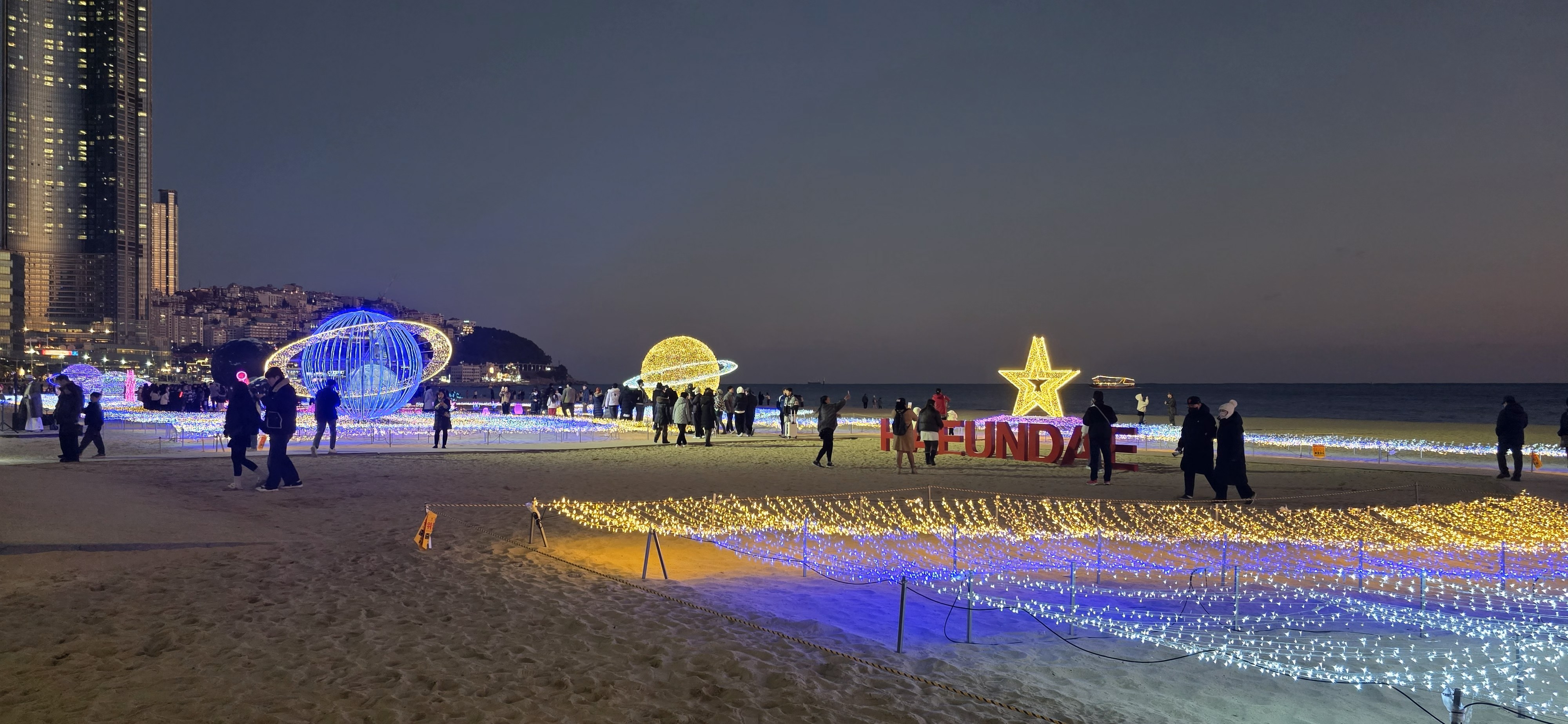 The galaxy of lights spreading behind the HAEUNDAE sign.