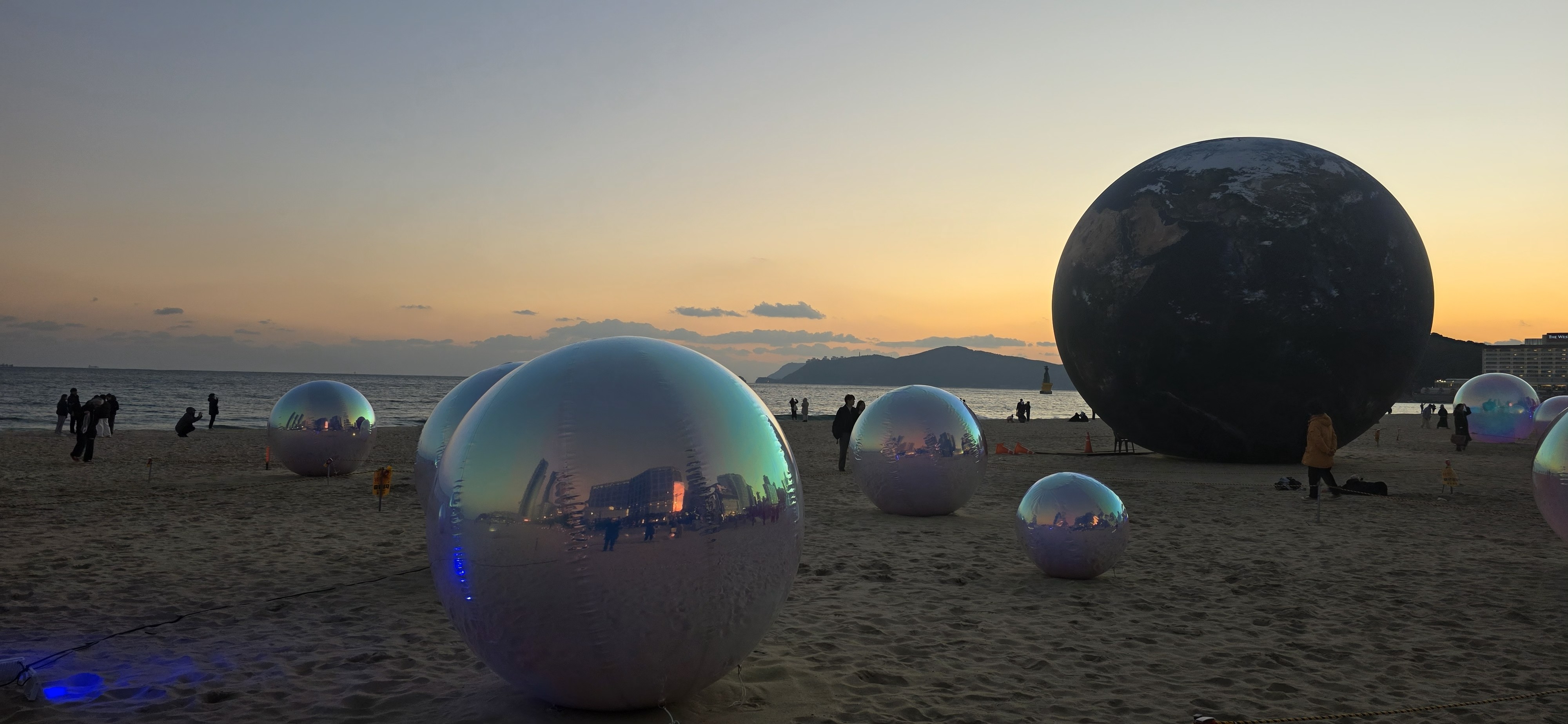 노을 지는 해운대 백사장, 거대한 구(Sphere)가 신비로운 분위기를 자아냅니다.