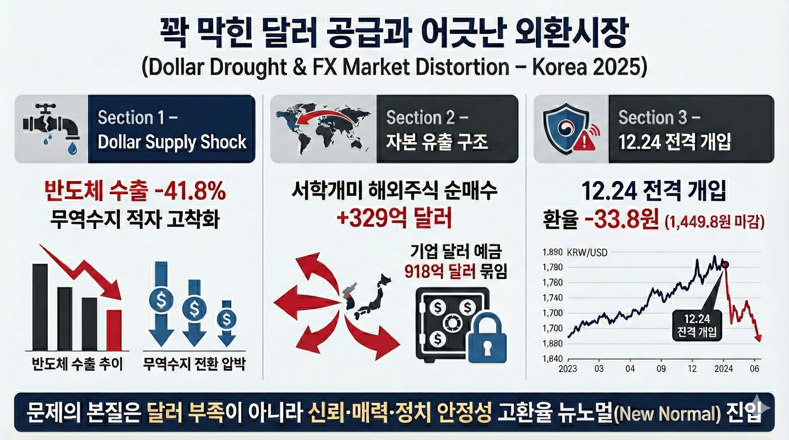 In December 2025, the South Korean economy stands at the peak of a liquidity crunch, with the KRW/USD exchange rate threatening the psychological support line of 1,480. This 'Dollar Drought' is a complex malady where cracks in real-sector fundamentals overlap with structural capital flight. This report provides a multidimensional analysis of the urgent moments of the 12.24 intervention and the raw realities of the Korean FX market.