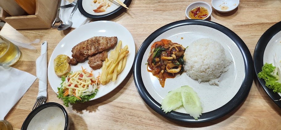 저녁 식사를 위해 저희가 향한 곳은, 어제 친구 부부와 마지막 식사를 했던 바로 그 식당이었습니다. 새로운 맛집을 탐험하는 대신, 검증된 맛과 편안한 분위기 속에서 여행의 마지막 밤을 보내고 싶었기 때문입니다. 저희는 팟타이와 덮밥, 스테이크 등 각자 가장 맛있게 먹었던 메뉴들을 다시 주문하며, 이번 방콕 7박 8일 여행을 복기했습니다.