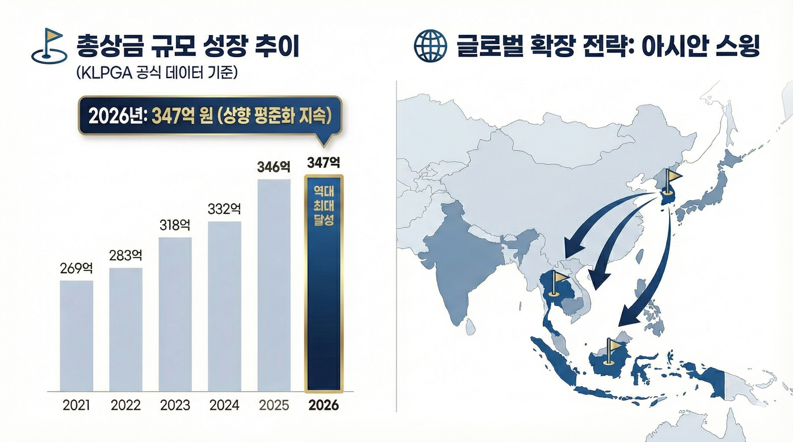 2026년 한국여자프로골프(KLPGA) 투어는 단순한 스포츠 시즌의 개막을 넘어, 대한민국 골프 산업의 구조적 성숙과 질적 도약을 증명하는 역사적 분기점이 될 전망입니다. 협회가 발표한 정규투어 일정과 상금 규모는 KLPGA가 양적 팽창을 넘어 '전 대회 상향 평준화'라는 새로운 패러다임으로 진입했음을 극명하게 보여줍니다. 본 보고서는 347억 원이라는 역대 최대 규모의 상금 구조와 선수단 재편이 가져올 산업적 파급 효과를 심층적으로 분석합니다.