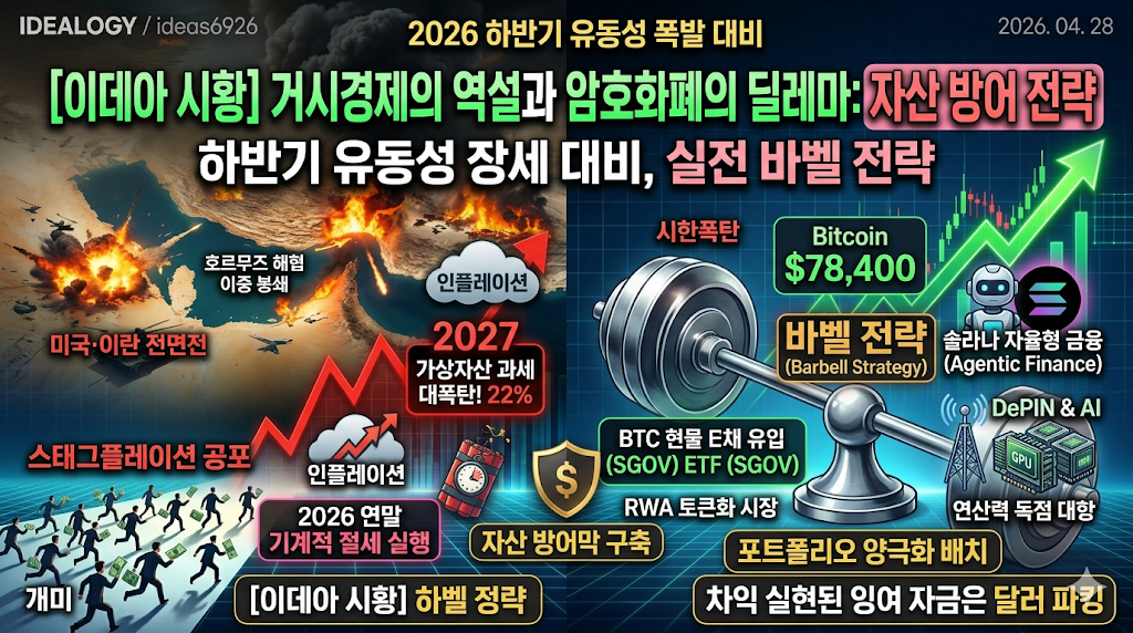 IDEALOGY / ideas6926 2026. 04. 23비트코인 $78,400 돌파와 유동성 파티: '디지털 금'의 수익을 달러로 고정하는 완벽한 방어 전략글로벌 유동성 파티가 예상보다 더 뜨겁게 달아오르고 있습니다. 코스피가
