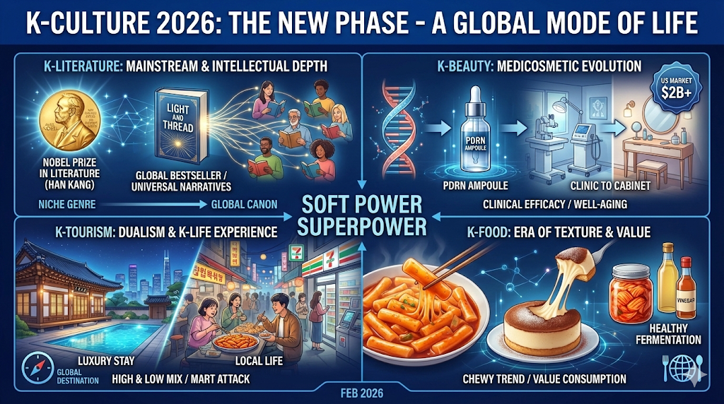 In 2026, K-Culture is no longer a fleeting fad. People worldwide find comfort in Korean novels, care for their skin with Korean products, and eat and travel like Koreans. This means K-Culture has established itself as a global Constant and a Mode of Life. Transforming from a manufacturing giant to a 'Soft Power Superpower'—this is Korea's true competitiveness in 2026.