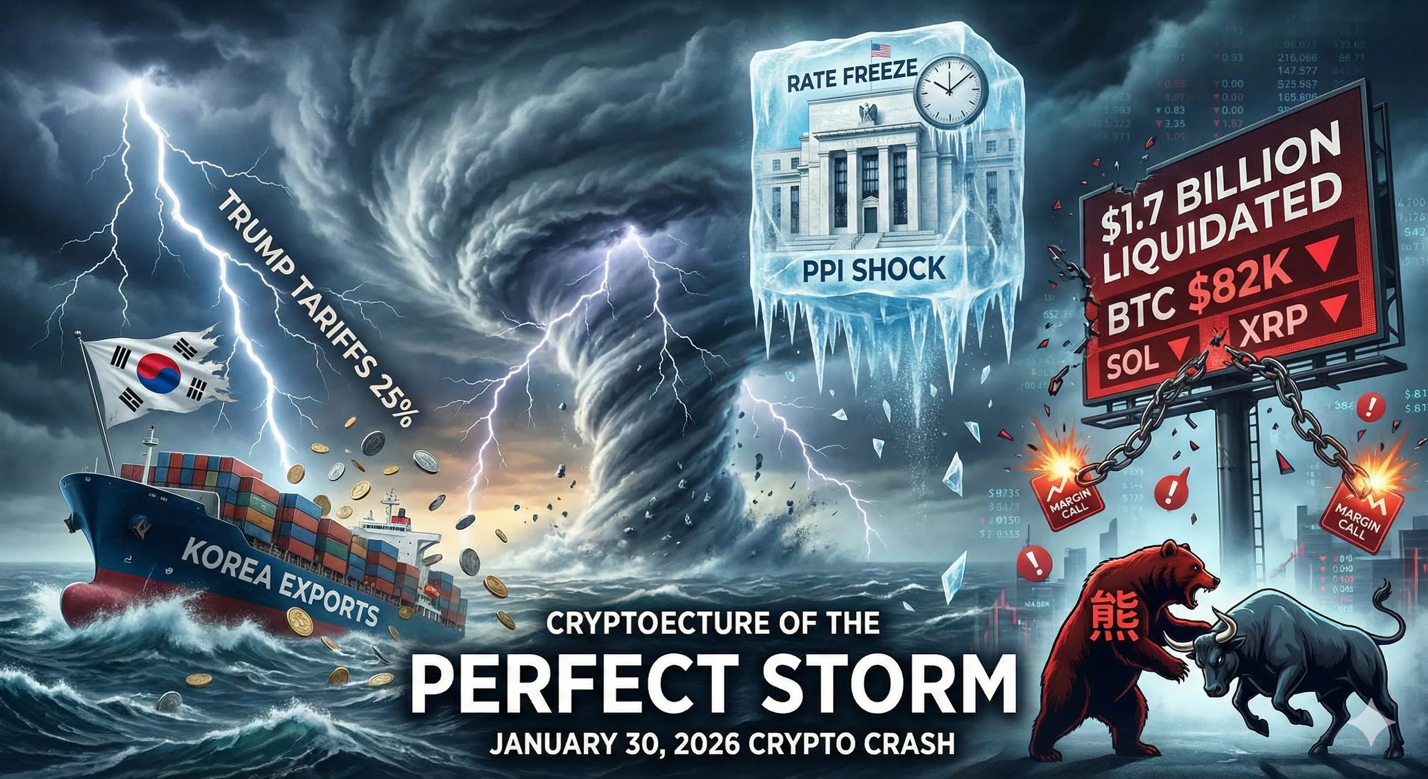 On January 30, 2026, the crypto market faced a Flash Crash, wiping out $1.7 billion in 24 hours. Bitcoin slipped to $82,000, and altcoins collapsed. This isn't just a correction. It's a Perfect Storm of Trump's tariffs, the Fed's betrayal, and the end of leverage. We analyze the market with a cold, hard look.