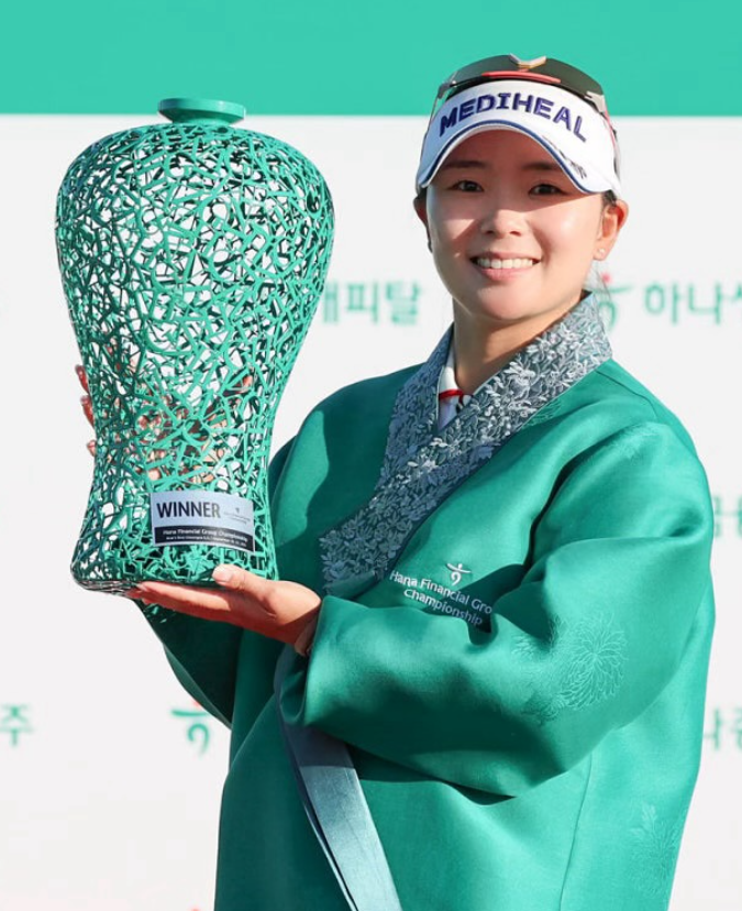 Lee Da-yeon holding the trophy after winning the 2024 Hana Financial Group Championship