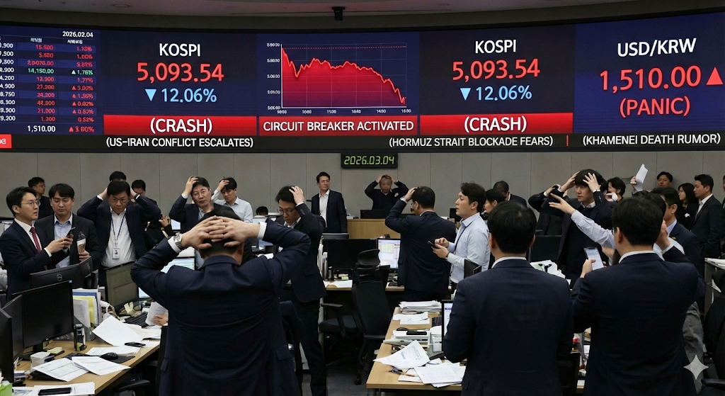 2026년 3월 4일, 대한민국 증시는 '미-이란 전면전' 공포로 인해 역대급 패닉(Black Wednesday)을 기록했습니다. 오전 11시 서킷브레이커 발동에도 불구하고, 코스피는 결국 -12% 폭락한 5,093선에서 마감했습니다. 펀더멘털이 아닌 공포가 지배한 시장, 내일(3월 5일)의 냉철한 대응 전략을 제시합니다.