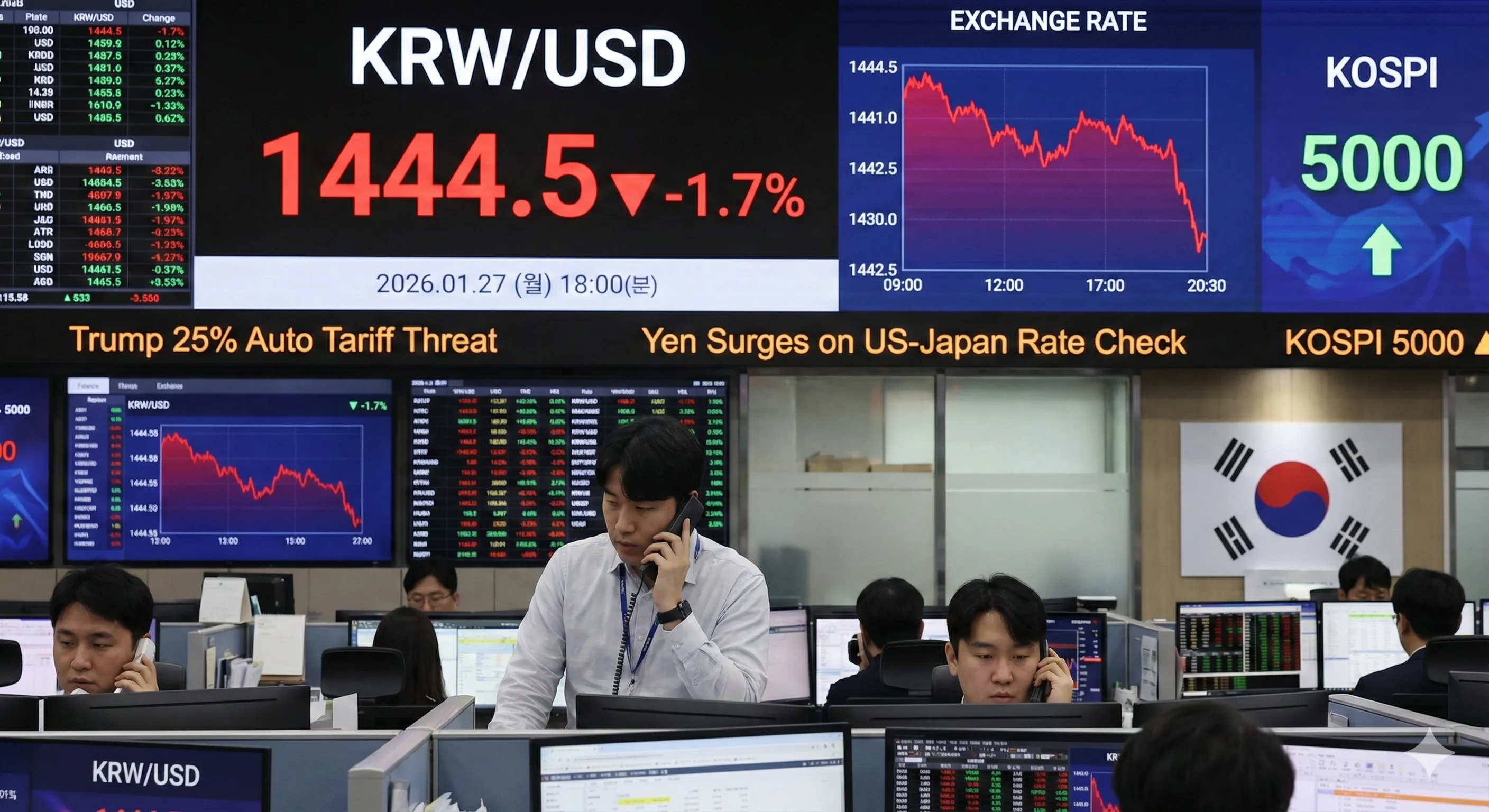 Did you see the Seoul Forex market today (Jan 27)? It was astonishing. Despite President Trump's threat of 25% tariffs on Korean autos, the KRW/USD rate plunged to 1,444.5 (Won strengthened). Usually, such bad news sends the rate soaring. Why is the market reacting this way? I've analyzed the real reasons behind this paradox.