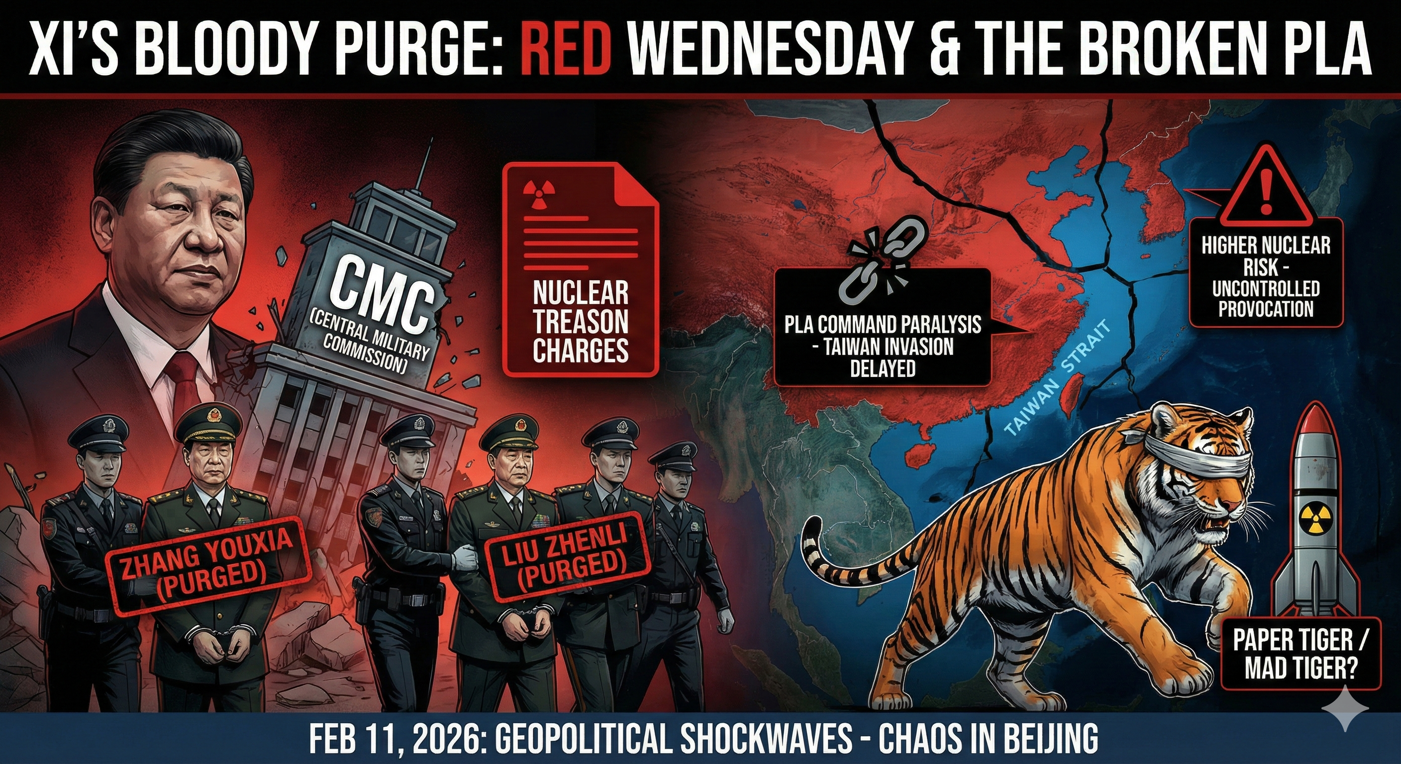 February 11, 2026. A purge colder than Beijing's winter wind is blowing. Xi Jinping's "brother" and PLA's #2 Zhang Youxia has been detained for 'Nuclear Treason,' and NPC Chairman Zhao Leji has fallen for resisting it. The CMC is dismantled, and the PLA command is paralyzed. We dissect whether this is the collapse of Xi's one-man rule or the final stone for his permanent reign.