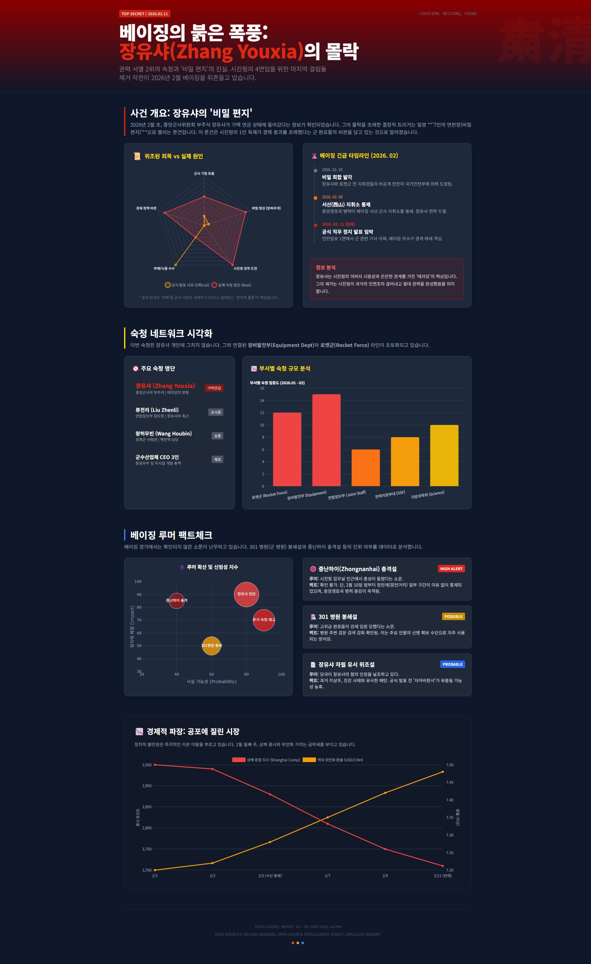 면책 조항 (Disclaimer) 본 보고서는 2026년 2월 11일까지 확인된 외신 보도, 정보 소식통 및 공개된 데이터를 바탕으로 작성된 시나리오 분석입니다. 중국 내 폐쇄적인 정치 환경 특성상 일부 정보(총격설 등)는 교차 검증이 어려울 수 있으며, 실제 상황은 급변할 수 있습니다. 본 내용은 정보 제공 목적이며, 특정 정치적 견해를 강요하지 않습니다.